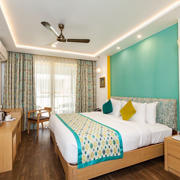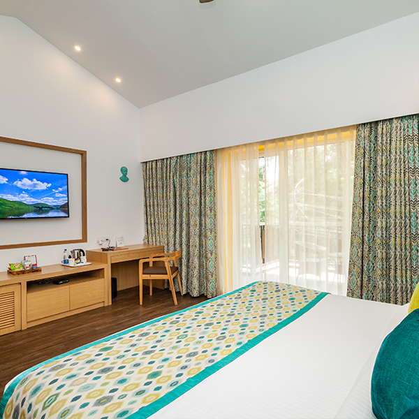 Styled for comfort with warm interiors and a soothing atmosphere, this room is ideal for an unhurried and pleasant stay offering a spacious balcony with a sit-out, creating an inviting setting to relax and enjoy the resort surroundings.