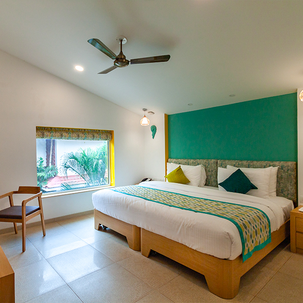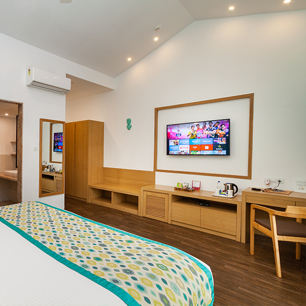 Styled for comfort with warm interiors and a soothing atmosphere, this room is ideal for an unhurried and pleasant stay offering a spacious balcony with a sit-out, creating an inviting setting to relax and enjoy the resort surroundings.